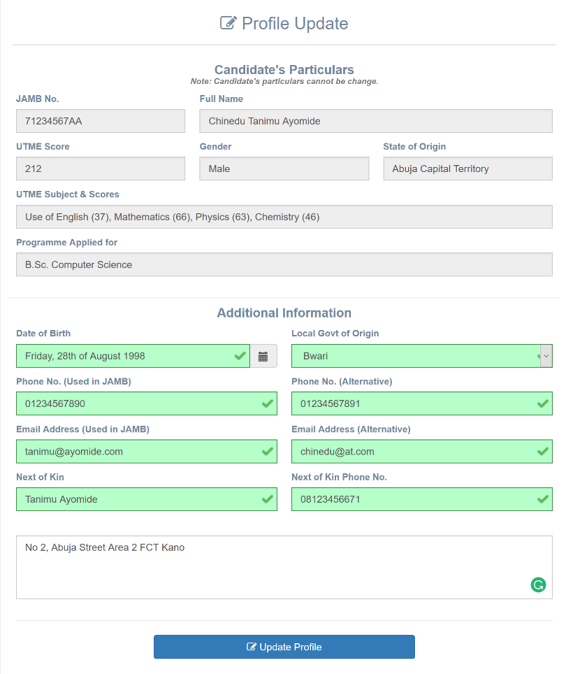Applicants are to provide their Date of birth, LGA, Phone Number used when registering with JAMB, Email address used when registering with JAMB, alternate Phone number, alternate Email address, Next of Kin, Phone Number of next of kin and Contact Address. Applicants cannot change their full name and state of origin. Applicants can choose the preferred email and phone number to be used in any correspondence, in case the email and/or phone number used in JAMB registration is not accessible to the applicant.