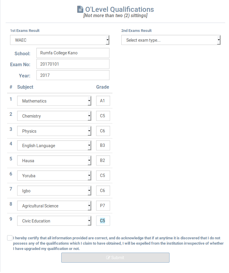 After successful profile update, you can then update your O’ Level results. For those awaiting examination, please enter 'AW' as grade and for those awaiting result should enter 'AR' as their grades. Note that supplying false information will result in disqualification. You are allowed to supply amaximum of two different ‘O’ Level examinations results.