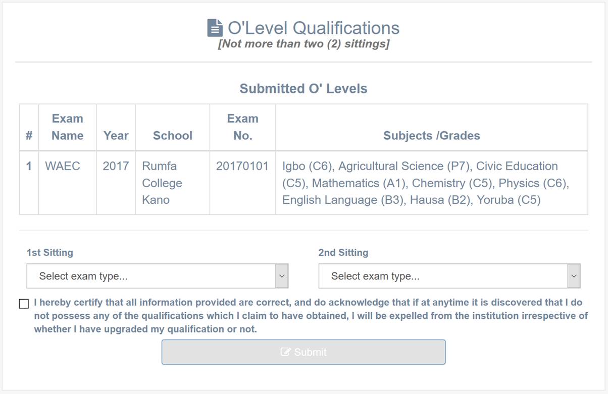 You need to check on the declaration in order to be able to submit your O’ Levels.
